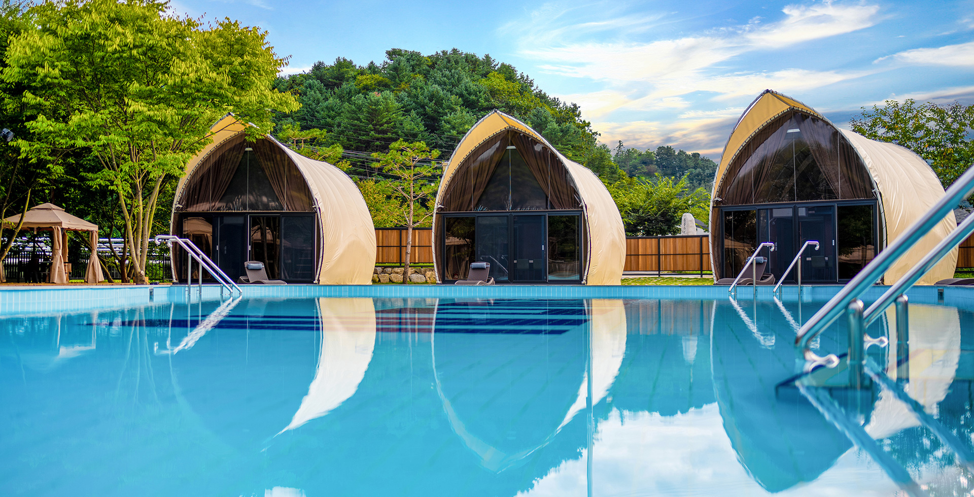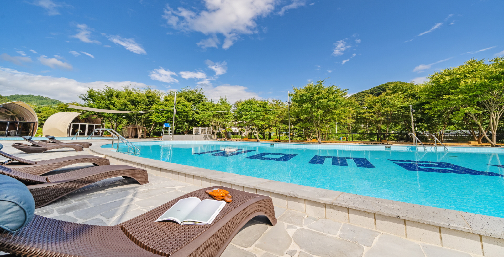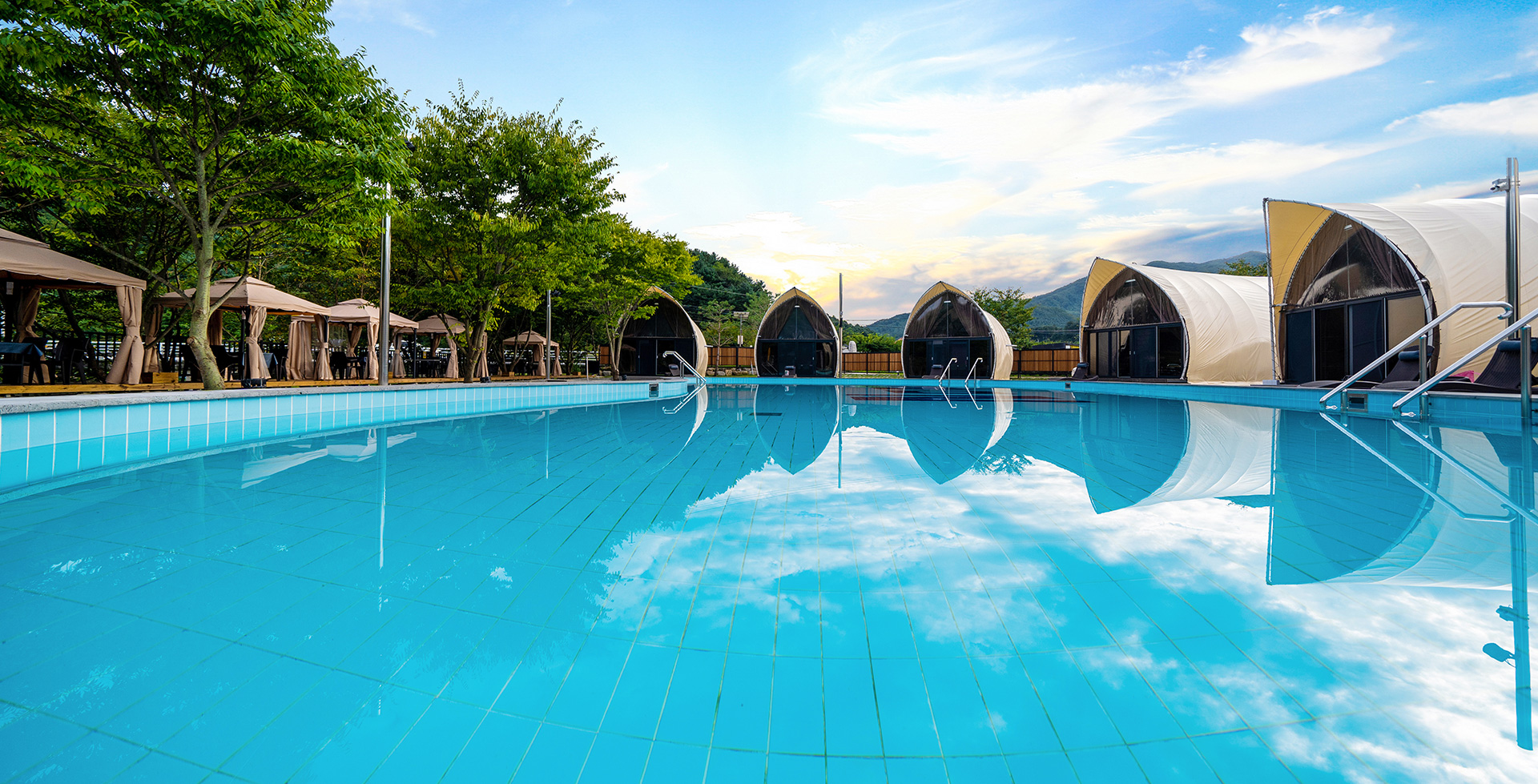 하늘과 산이 어우러진 맑은 공기 가득한 자연속 수영장에서
