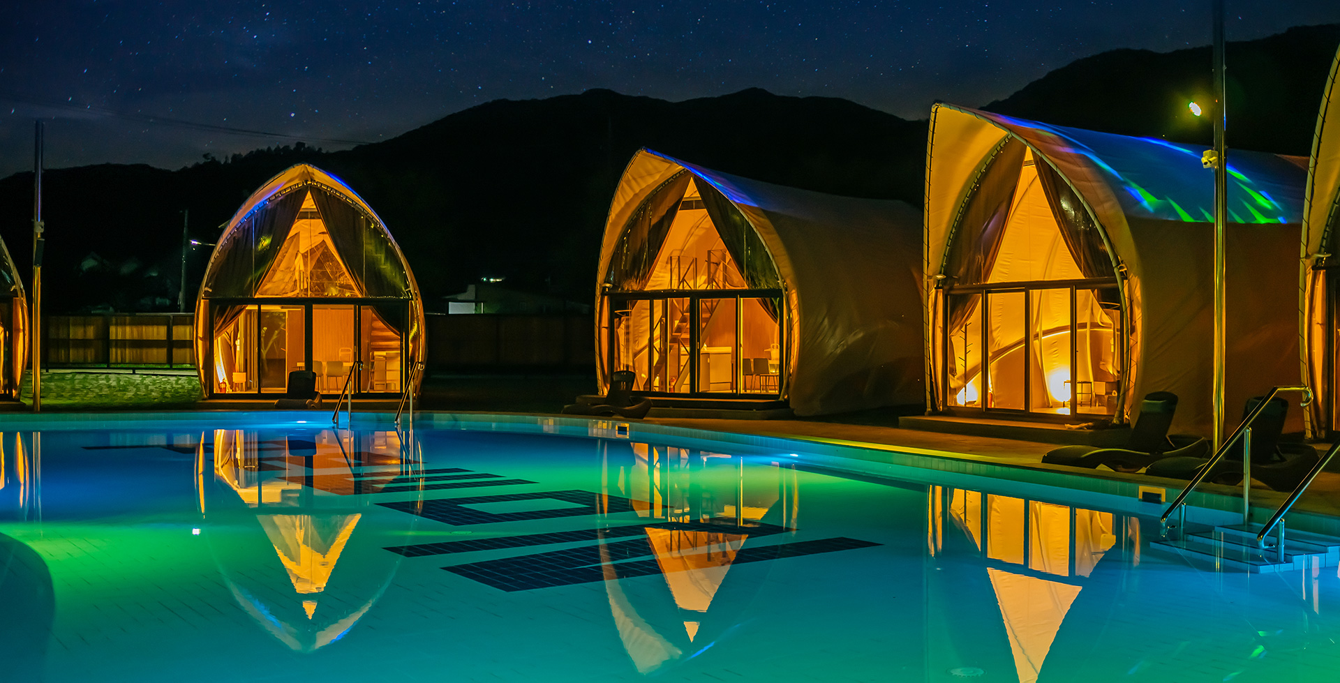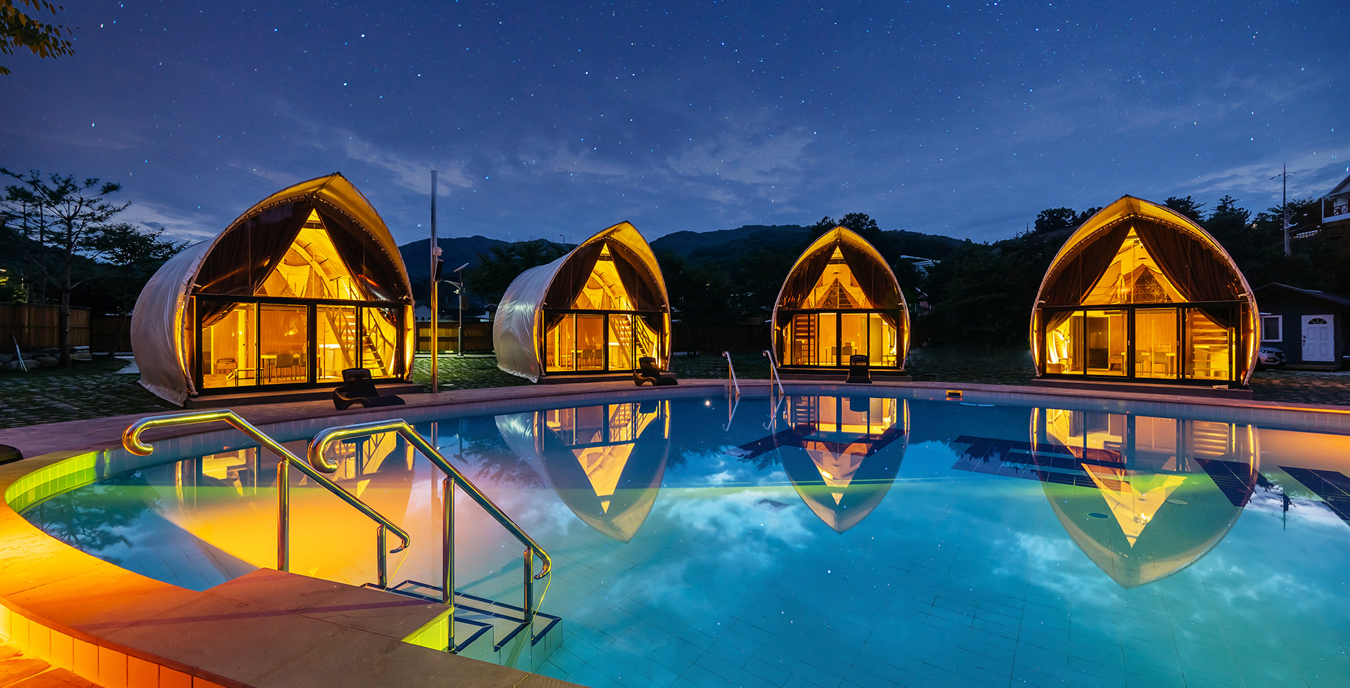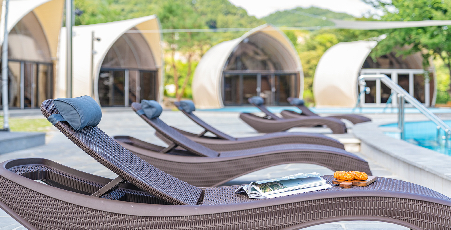하늘과 산이 어우러진 맑은 공기 가득한 자연속 수영장에서