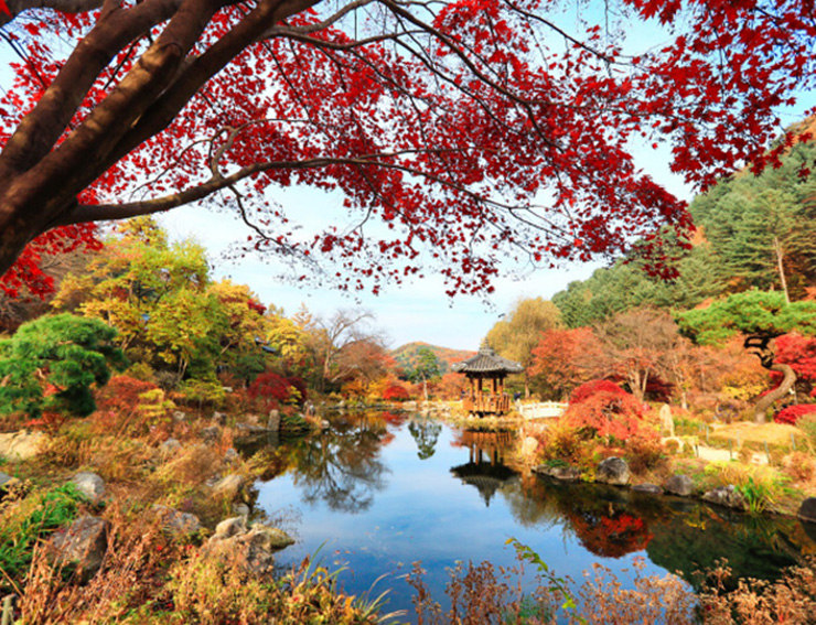아침고요수목원은 축령산의 빼어난 자연경관을 배경으로 하여 한국의 미를 듬뿍 담은 정원들을 원예학적으로 조화시켜